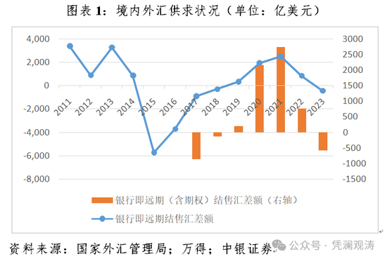 不过,当前境内外汇市场压力远不及2015年“8·11”汇改初期。由于外汇局2016年开始公布外汇期权交易数据,故年度银行即远期(含期权)结售汇的数据从2017年起计算。从可比的银行即远期结售汇差额看,2023年逆差436亿美元,远低于2015、2016年分别逆差5712亿和3695亿美元的规模,也低于2017年的893亿美元(见图表1)。