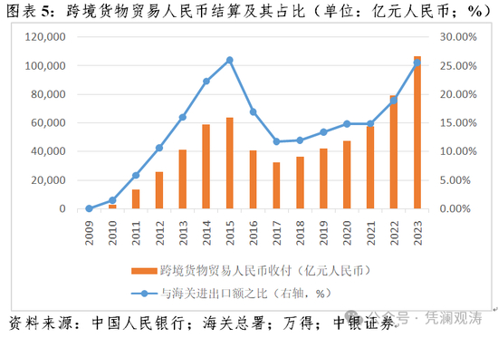 跨境人民币收付占比大幅上升是2023年我国跨境资金流动的一大亮点,反映越来越多的对外贸易和投融资活动使用人民币结算。据人民银行统计,2023年,跨境货物贸易人民币结算额为10.69万亿元,增长35.0%,相当于海关进出口额的25.6%,跳升了6.7个百分点,较2015年高点仅差了0.4个百分点(见图表5);熊猫债托管量增加373亿元,较上年增长3.31倍。