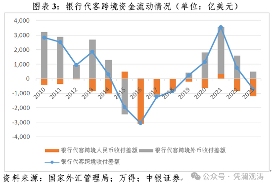 外汇局统计显示,全年旅游项下支出1737亿美元,较上年增长47.6%,远高于2020~2022年年均下降22.3%和2015~2019年为年均增长8.8%的水平,但绝对额仅恢复到了2015~2019年均值的67.1%(见图表9),更多属于大疫三年之后的出境游需求的集中释放。而且,据民航总局统计,2023年,我国民航国际航线总周转量恢复到了2015~2019年均值的83.6%。当然,全年旅游支出额高达上千亿美元,说其中绝对没有隐藏个人对外资本转移肯定不现实,只是对此难以量化,监管成本也很高。此外,“两头在外”的对敲式的个人非法资本转移或是更为主要的方式,但这不反映在银行代客结售汇和跨境收付中。
