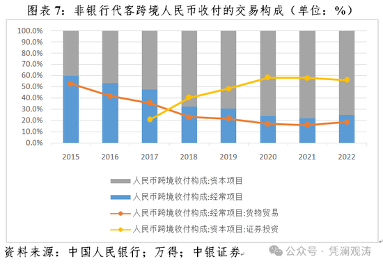 跨境人民币结算不等于计价,不必然可以帮助境内主体规避人民币汇率波动风险。据人民银行统计,目前我国跨境人民币结算中,资本项目占到七成以上(近六成发生在证券投资项下,主要是债券通项下跨境资金往来),货物贸易占比不到两成(见图表7)。贸易项下,如果计价货币依然是外币,只是收付款时用本币办理,这相当于将人民币外汇兑换放在境外,境内进出口商仍要承担汇率波动风险。资本项下,用人民币对外投资,若在境外不能买到人民币计价的金融资产,则仍需在离岸换成硬通货或当地货币;用人民币利用外资或对外举债,虽然境内主体可以规避汇率波动风险,但境外投资者或债权人仍需承担资产与负债币种错配引发的汇率风险。