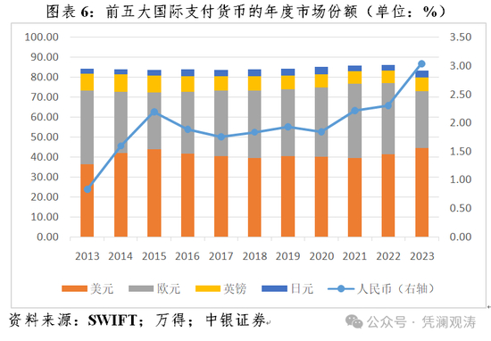 人民币国际支付和融资功能得到提升。据环球银行同业金融电讯协会(SWIFT)统计,2023年最后两个月,人民币国际支付份额跃居第四位,分别为4.61%和4.14%,年度(12个月平均)份额为3.05%,较上年提高0.74个百分点(见图表6);2023年9月,人民币在全球贸易融资中占比5.8%,同比上升1.6个百分点,排名升至第二。