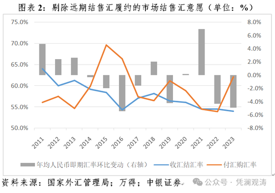 外汇供求逆转主要是因为市场主体结汇意愿基本稳定而购汇动机大幅增强。2023年,剔除远期结售汇履约的银行代客收汇结汇率为54.0%,较上年小幅回落0.4个百分点,付汇购汇率为62.2%,大幅上升8.2个百分点。2022年,则是收汇结汇率基本持平,付汇购汇率小幅回落0.6个百分点。需要指出的是,年度银行代客收汇结汇率跌至有数据以来新低,付汇购汇率却仍远低于2015、2016年分别为69.6%和66.4%的水平。这表明当前市场囤积外汇的意愿虽略强于七八年前(2015、2016年分别为58.4%和54.3%),但抢购外汇的动机远弱于彼时(见图表2)。其背后的底层逻辑是,经历了2015和2016年两年藏汇于民与偿还外债的集中调整后,我国民间对外净负债大幅减少、货币错配明显改善,加之人民币汇率双向波动日益明显,增强了市场主体对于汇率波动的容忍度和承受力。