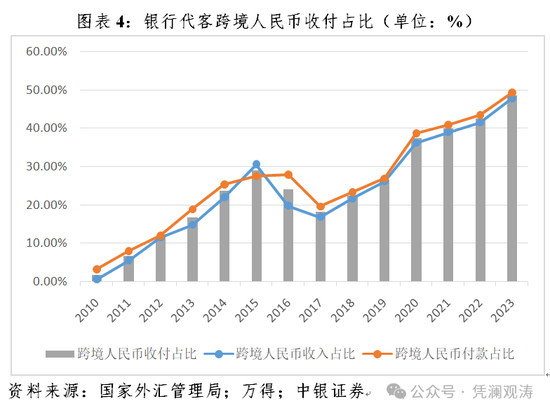 跨境以人民币收款替代外汇收入增加较多,加速了跨境外币收付顺差收敛。2023年,银行代客跨境收付中,人民币占比48.6%,较上年上升6.2个百分点,超过美元跃居境内第一大跨境收付币种。其中,跨境人民币收入占比47.9%,上升6.4个百分点;付款占比49.3%,上升5.9个百分点(见图表4)。同期,银行代客跨境收入下降0.9%,付款增长1.4%;跨境外币收入减少4286亿美元(下降11.7%),贡献了同期跨境外币收付顺差减少额的391.0%,跨境外币付款减少3190亿美元(下降9.1%),负贡献291.0%。