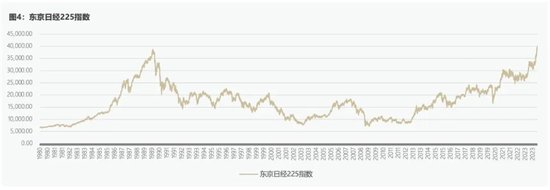 如图4所示,日经225指数的峰值出现在1989年末,接近39000点,随后进入震荡下行的阶段,并在2003年下跌至7600点,此时市值缩水近80%。如果将国际金融危机视为一场外生冲击的话,我们倾向于认为,日本股市事实上是从2003年开始触底回升,并震荡增长至今,到2024年2月底已经达到39208点,刚好回到了此前峰值的水平。