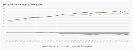 从人均GDP来看也是如此,如图2所示,按照实际人均GDP的水平来看,日本在1990年-2019年的平均增速为0.82%,而除日本外的其他国家平均增速为1.21%。