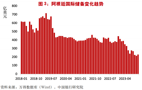 在资本持续外流背景下,阿根廷国际储备匮乏问题凸显,外债偿付能力下降。截至2023年底,阿根廷持有的国际储备资产仅为230.7亿美元,较2022年底下降48.3%(图3)。其中,外汇储备资产约为168亿美元,较2022年底下降52.5%。