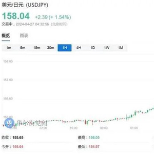 北京时间周六凌晨,日元持续下跌不止,美元兑日元盘中突破158关口,达到158.05一线,幅度为1.5%。
