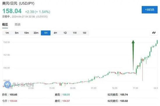 截至发稿,美元兑日元逼近158.3一线,不断刷新34年新低。