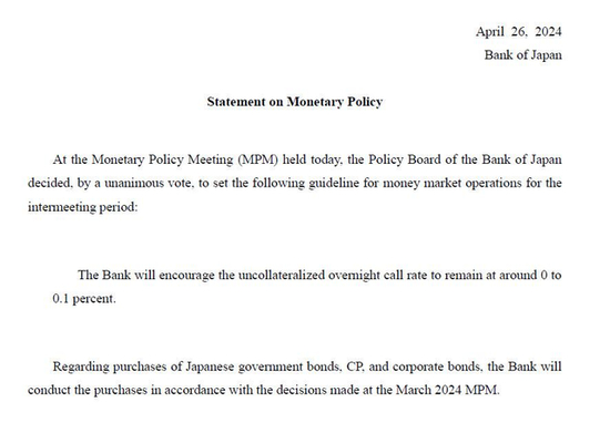 4月26日周五,日本央行4月议息会议如期维持利率不变,预计目前宽松的金融环境将继续,删除了“购买与之前相同数量债券”的措辞。