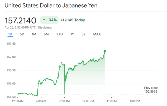 北京时间周五晚,美元兑日元盘中突破157,达到157.40一线,日内大涨1.1%,为1990年5月10日以来首次。