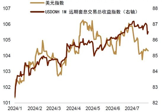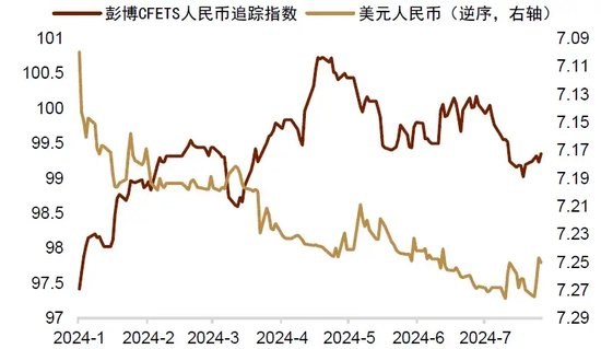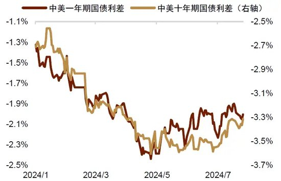 首先是降息交易在7月升温缩小了利差并压制了美元。由于美国6月失业率攀升至4.1%,且核心CPI环比增速回落至0.1%的偏温和水平,市场对美联储9月的降息预期有所升温。目前衍生品市场已基本定价美联储将在9月进行首次降息,降息交易的直接影响是美债收益率的下行和美元的回落。7月美元指数有所回落(图表4),人民币对一篮子货币从偏高水平回落(图表5)。而美元利率的下行则令中美利差改善(图表6)。这都从多个维度给予人民币汇率一定支持。