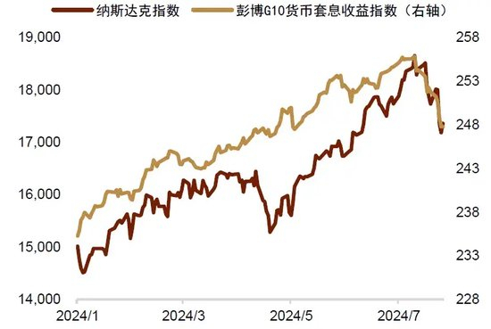 首先,从外部环境看,随着美国大选季和美联储降息启动时间点的临近,金融市场的不确定性或将持续处于偏高水平,而美元与非美货币利差的稳定性也会因为降息的临近而有所下降。这对于杠杆交易是不利的,因此风险资产可能会继续维持偏高波动。而就外汇套息交易头寸本身而言,除了利差不稳定之外,美国选情的变化以及候选人对汇率的言论都有一定可能带动市场的短期波动。我们认为相关外生事件的频次增加,也容易让套息交易者将仓位控制在比上半年更低的水平。我们比较彭博制作的G10货币套息收益指数和美国纳斯达克指数后发现,两者的联动性在近期有所加强,这或代表此前偏拥挤的交易在近期出现了转向(图表13)。
