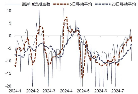 7月25日,在岸人民币汇率升值约0.23%,日内最大升幅约550 pips,这是2023年11月4月以来在岸人民币最大的单日升值。离岸人民币汇率升值约0.36%,日内最大升幅近700 pips,是为2023年9月12日以来最大单日升幅记录。人民币的反弹也让即期价格与中间价之间的价差有所收敛,25日当天日内即期价格最高到过7.2087,距离中间价为766个基点,为3月13日以来最近(图表1)。