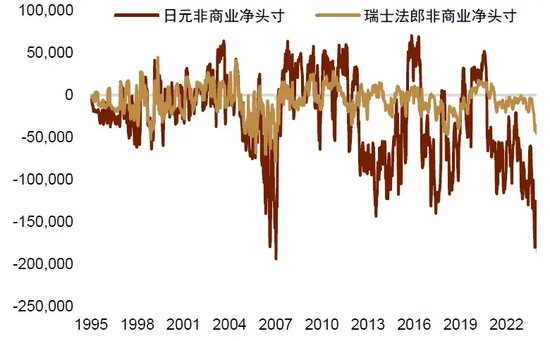 图表8:日元和瑞士法郎净空头处于历史较极端水平