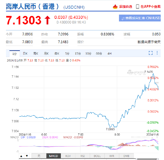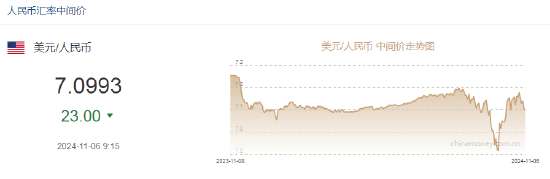 11月6日,人民币中间价报7.0993,上调23点,上一交易日中间价报7.1016。离岸人民币日内跌超300点。