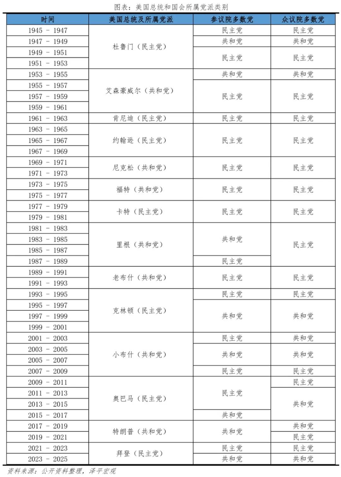 特朗普在就任美国第45任总统时,参众两院多数党由相同到分裂,对政策推进产生了一定影响。2017年-2018年,共和党掌控了参众两院多数席位,特朗普政府较顺利地通过了税改法案《减税与就业法案》;2019-2020年,民主党掌控众议院多数席位,共和党仍掌握参议院多数席位,“分裂政府”局面使得特朗普推行政策法案的难度显著增加。民主党控制的众议院在移民、医保、基础设施、疫情纾困方案等方面与共和党控制的参议院意见分歧,相关法案难以达成一致。2018年特朗普政府提议规模达1.5万亿美元的基础设施项目,但由于民主党支持联邦政府支出,在2019年掌控众议院后,驳回该提议,最终基建计划未能通过。