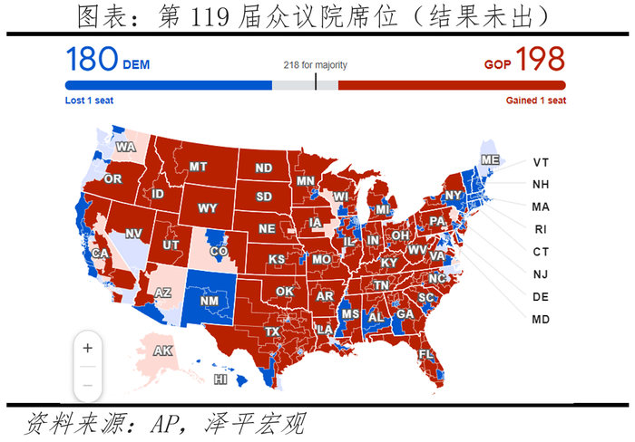 共和党大概率控制众议院。众议院所有435个席位将在11月5日的选举中决定。截至目前,民主党和共和党分别拥有众议院180个、198个席位,各机构预测席位接近,共和党可能以微弱优势获胜。
