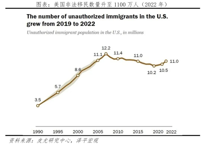 主张激进的特朗普为何能再度崛起?政治极化的背后是社会撕裂,民众获得感不强、逆全球化思潮涌动、民粹主义兴起。近年来,美国阶层固化、通胀、非法移民等加剧底层民众的被剥夺感民粹主义思潮生根根据皮尤研究中心的美国社区调查数据,在美非法移民人口从2021年的1050万人增长至2022年的1100万,扭转2007-2019年的长期下降趋势。美国收入分配差距持续扩大,2022年基尼系数升至0.63,教育不公平使得民众阶层跃升愈发困难。2024年,美国制造业空心化愈加严重,长期高通胀和经济下滑风险加剧民众对民主党不满。
