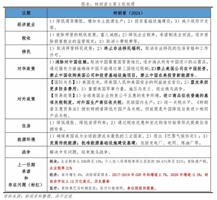 1)经济与就业层面,承诺制造业回流,逐步废除损害就业的监管规定;认为通过增加本土能源生产、废除拜登的税收政策、降低企业税率等方式降低通胀。