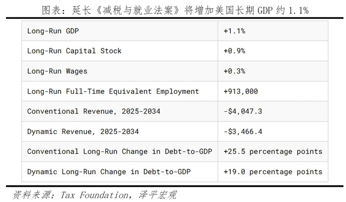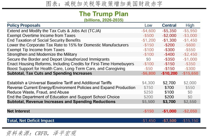 据CRFB测算,特朗普提议修改和拓展《减税与就业法案》、减税、加征关税等政策将使得美国在2026-2035财年增加约7.75万亿美元赤字(中性条件)。税收基金会测算,延长《减税与就业法案》将使得美国长期GDP增加约1.1%,增加913000个全职岗位;《减税与就业法案》永久性条款将会增加所有收入群体的税后收入,2026 年纳税人的税后收入将平均增长 2.9%,长期增长约3.0%。特朗普政策主张带有通胀属性,减税等主张从需求侧推高通胀,而关税和驱逐非法移民则从供给端推高通胀;研究表明在上一轮贸易摩擦中,美国加征关税几乎都转嫁到了美国的进口商和消费者身上;Zandi(2024)认为,特朗普加征关税使得美国2025年GDP增加0.8个百分点。