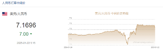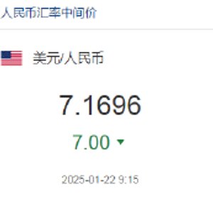 1月22日,人民币兑美元中间价较上日调升7点至7.1696。