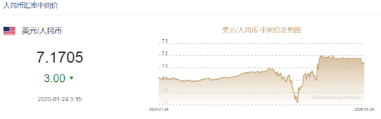 1月24日,人民币兑美元中间价报7.1705,上调3点。