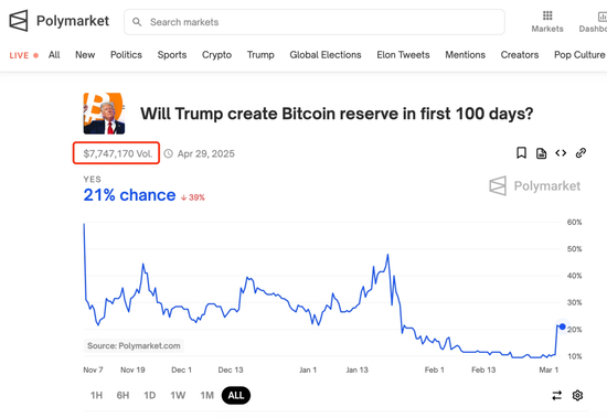 截止目前,Polymarket 上“特朗普上任 100 天内建立战略比特币储备”可能性升至 21% ,押注资金数额为 774 万美元左右。1 月 20 日特朗普宣誓就职总统当日,该押注可能性曾一度升至 48% 。