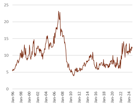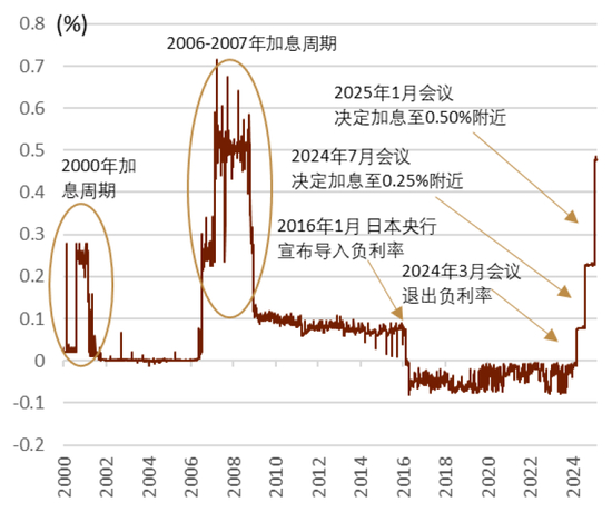 日本央行在1月会议中将政策利率提高至0.50%,该位置也为本世纪以来的日本央行政策利率高点(图表10),但是在通胀背景下,我们认为日本央行将继续加息,下次加息的时期最早或是5月1日的议息会议(加息25bps),同时2025年内不排除日本央行进一步加息至1%的可能性。