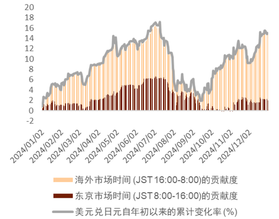 图表3:2024年期间不同交易时间的美日汇率变化贡献度的走势