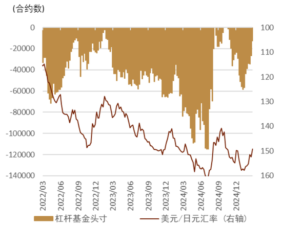 2024年7-8月前后,日元套息交易的逆转给全球金融市场带来了明显扰动。关于其规模,日本政府、日本央行、日本金融机构都认为难以精准统计日元套息交易的具体规模,但目前有两个间接指标在日本金融市场被用作估测套息交易规模的参考。其一是“外国商业银行在日本分行的资产规模”,其二是美国商品期货交易委员会(CFTC)发布的芝加哥商业交易所(CME)国际货币市场分部(IMM)的货币持仓报告中的数据。“外国商业银行在日本分行的资产规模”在2024年之后该指标并未出现明显变化(图表19)。与此相对,作为后者的“IMM中的杠杆基金日元净头寸”相对更为“敏感”(图表20),在24年8月之前杠杆基金的净空头处于极值附近,但在去年8月之后受日元短期内大幅升值的影响,套息交易出现逆转,净空头迅速缩减至零附近。2025年2月,日元净空头依然存在,但是规模相对有限,远非极值程度。因此我们认为净空头大幅被逆转进而带来急剧的日元升值或为小概率事件,同时大量的套息交易逆转给全球金融市场带来明显冲击也可能为小概率事件。