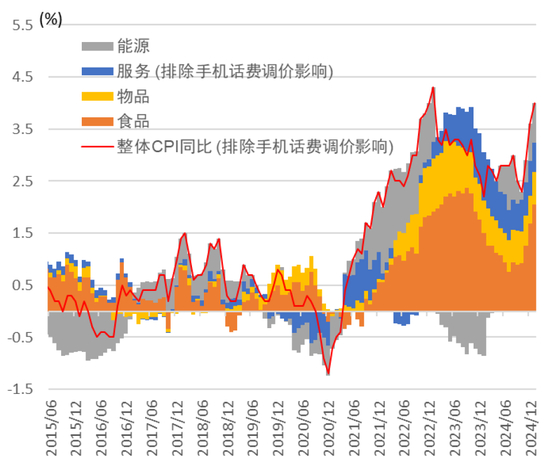 或许众多投资者还留有日本长期处于通缩的“老印象”,但是最近的事实是25年1月的综合CPI同比来看日本高达4.0%,为主要发达经济体中最高的水平(图表7)。此外,同过去的日本相比来看,目前日本通胀也为30多年来的最高水平(图表8)。日本目前高涨的通胀背后是“成本推升(食品、能源等)”与“需求拉动(核心物品、服务)”的共同推动(图表9)。我们认为“成本推升”与“需求拉动”等项目带来的拉动也更多是表面现象,更深层的含义在于日本的内生通胀压力正在逐步加大,日本央行过去长期宽松带来的滞后的通胀压力正在逐步形成,日本正在彻底走出过去的长期通缩。