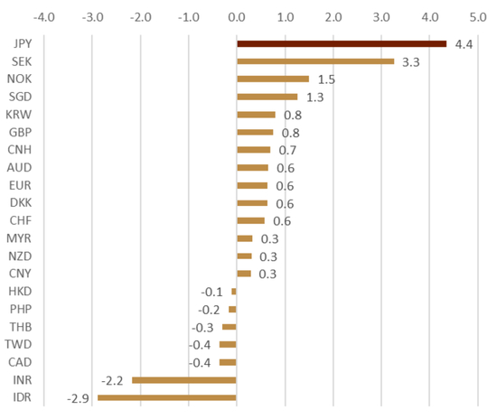 图表1:2025年以来G10以及亚洲货币相较美元的涨跌幅度(%)