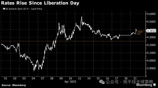 对特朗普、贝森特以及所有市场参与者来说,最可怕的图表之一,就是自“解放日”以来(市场对新一轮关税政策的定价起点),尽管美股出现明显回调,但长端美债收益率非但没有下行,反而持续走高。