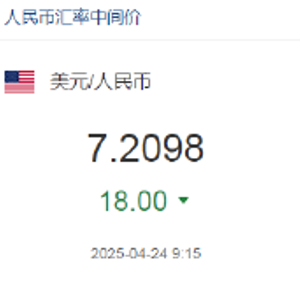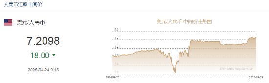 4月24日,人民币兑美元中间价报7.2098,上调18点。
