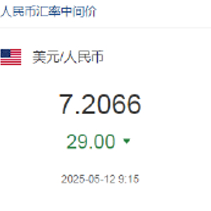 5月12日,人民币兑美元中间价报7.2066,上调29点。