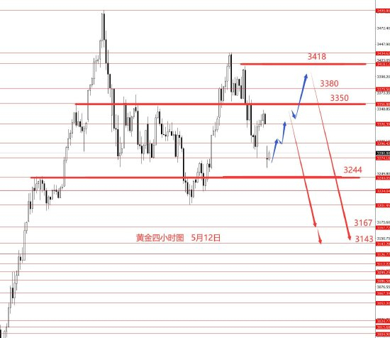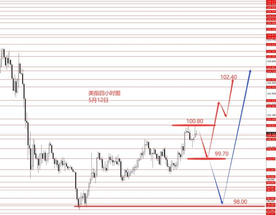 5月12日,上周美指正如预期向上运行,周图收阳柱。从图形来看,美指修整行情还未结束,这个区域震荡时间大概需要2-3个月,区间为97.30-103.20区间,所以近期就不要去想大行情,都是以震荡短线为主。本周初重点关注上方100.80区域强阻力,留意承压向下短线修正行情,后市是继续回踩99.70震荡上行,还是会深度二次探底,目前不确定。今日周一先观望,然后再走一步看一步吧。分析图仅供参考风险自负。