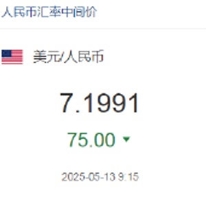 5月13日,人民币兑美元中间价报7.1991,上调75点。升值至2025年4月7日以来最高,升幅创2025年1月21日以来最大。