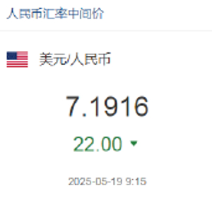 5月19日,人民币兑美元中间价报7.1916,上调22点。