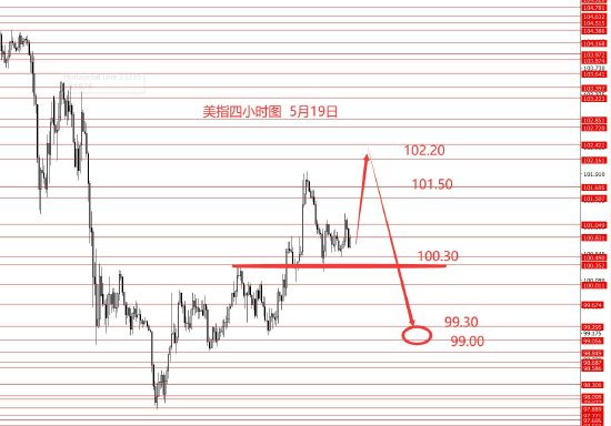 5月19日,上周一美指直接向上破位,到达102附近后承压震荡修整,周图收阳柱。从图形来看,美指仍在震荡修整,后市继续在97.80-103.20区间震荡时间周期最少还有1-2个月时间,震荡完结后,再继续中线下跌。本周短线仍然以震荡格局为主,周初关注100.30区域强支撑,以上继续上行,上方关注101.50和102.20/102.40区域,再择机做空,下方关注99.30和99.00区域强支撑。今日只有框架思路,没有具体操作建议。