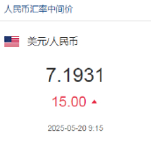 5月20日,人民币兑美元中间价报7.1931,下调15点。