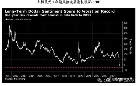 进一步推演,如果懂王2.0继续在MMT的道路上狂奔,那么美元资产的不稳定性会越来越高。从市场定价看,远端的美元看跌情绪(1y 25D rr隐波)已经来到历史极值,市场的悲观情绪可见一斑。