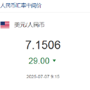 7月7日,人民币兑美元中间价报7.1506,上调29.00点。