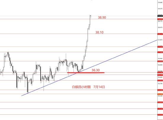 白银正如预期36.30上方得支撑继续上行,最高38.90区域,比预期的38.10还要高。从图形来看,36.30得以支撑向上拉涨后,一直为阳柱直线拉涨,并未给出任何向下信号,所以今日继续向上创新高的概率较大些,上方留意40.80强阻力,至于能不能到位不确定,目前还是明朗的上涨趋势,不能做空。但从36.30涨上来这波也差不多了,所以此区域价位太高,也不建议去追涨,保守者观望等待先。若承压给出向下信号,也只是回调,目前看不到大跌信号。所以等等图形演变情况再定下一步操作。