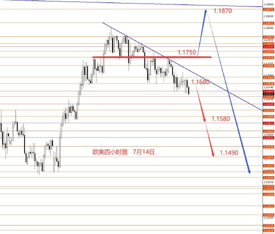 7月14日,美指上周震荡上行,周图收阳柱。从图形来看,符合波段预期分析,只是底部到否再次震荡后形成复合式底部还是后市力度加大后反弹继续,从反弹演变成反转,还有待进一步确认。唯一能确定的就是美指的下跌波段行情完结了,后市还是以逢低做多美指为主。本周建议先以后市直接拉涨行情思路操作,97.50以上继续拉涨上行格局操作,若跌回至97.50下方后,再按二次探底思路操作,两手准备。今日操作建议:97.80附近做多,止损97.40,目标先看向98.30和98.70/98.85,成功站稳98.85上方后再看向99.70和100区域。备线二次回踩做国备选方案,切记控制仓量并严格止损。