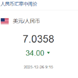 12月26日,人民币兑美元中间价报7.0358,上调34点。升值至2024年9月30日以来最高。