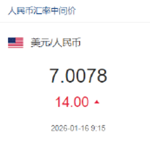 1月16日,人民币兑美元中间价报7.0078,下调14点。