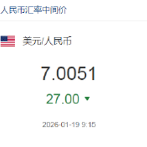 1月19日,人民币兑美元中间价报7.0051,上调27点。升值至2023年5月18日以来最高。