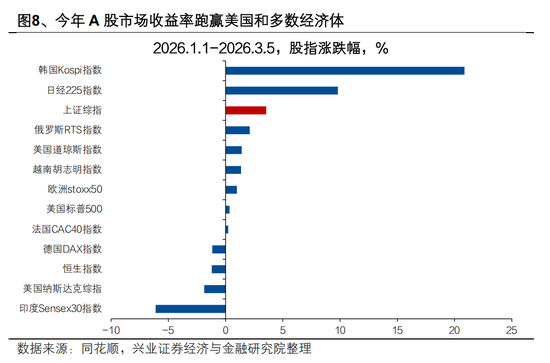 拆分人民币升值的贡献,今年和2025年有明显不同。2025年人民币升值的主要贡献是美元的贬值,全年人民币升值5%但美元贬值10%,因此人民币相对于非美货币是贬值的;而今年以来,人民币的升值是美元和非美货币共同贬值的结果。3月以来,虽然人民币略有贬值,但贬值幅度弱于美元升值幅度,即人民币升值的基本盘仍在,美元的冲击大概率仅仅是一个边际的扰动。