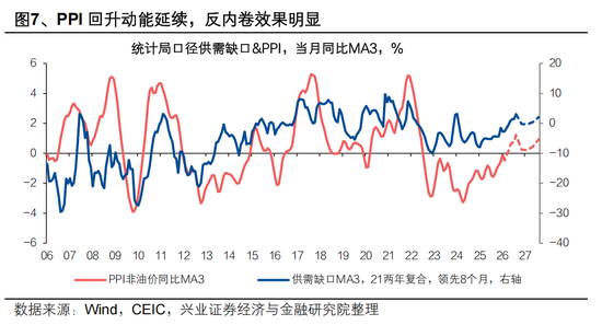 PPI即将转正,反内卷效果显著。过去一年中国底层发展逻辑正在转变,反内卷、战通缩、振内需是中国改变的方向。而效果来看,近期PPI快速回暖,从供需缺口来前瞻PPI,可能将很快进入正值区间。这也意味着,过往持续通缩、内部竞争加剧、企业盈利能力处于低位状态将随之打破。