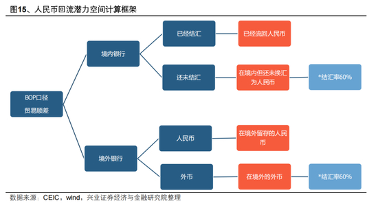 二是实际跨境贸易中,人民币结算支付的比例已经上升至近30%。随着人民币国际化的逐渐推进,国际贸易中人民币支付的比例逐渐上升,当前已接近30%。即估算回流潜力时,需要扣除掉已经用人民币结算的部分。